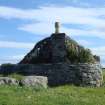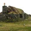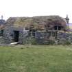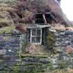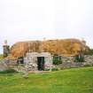 Hebridean-type thatched cottage (at south west end of row of 3 adjoining). Single storey; 4 bays. Modern corrugated-iron lean-to porch towards left on south east front; small-paned windows with splayed reveals. Massively thick battered walls, with rounded corners; built of coursed rubble. End stacks; axial flue; muran thatch roof, secured with netting and ropes, stone weights over inner wall head. (Historic Scotland)